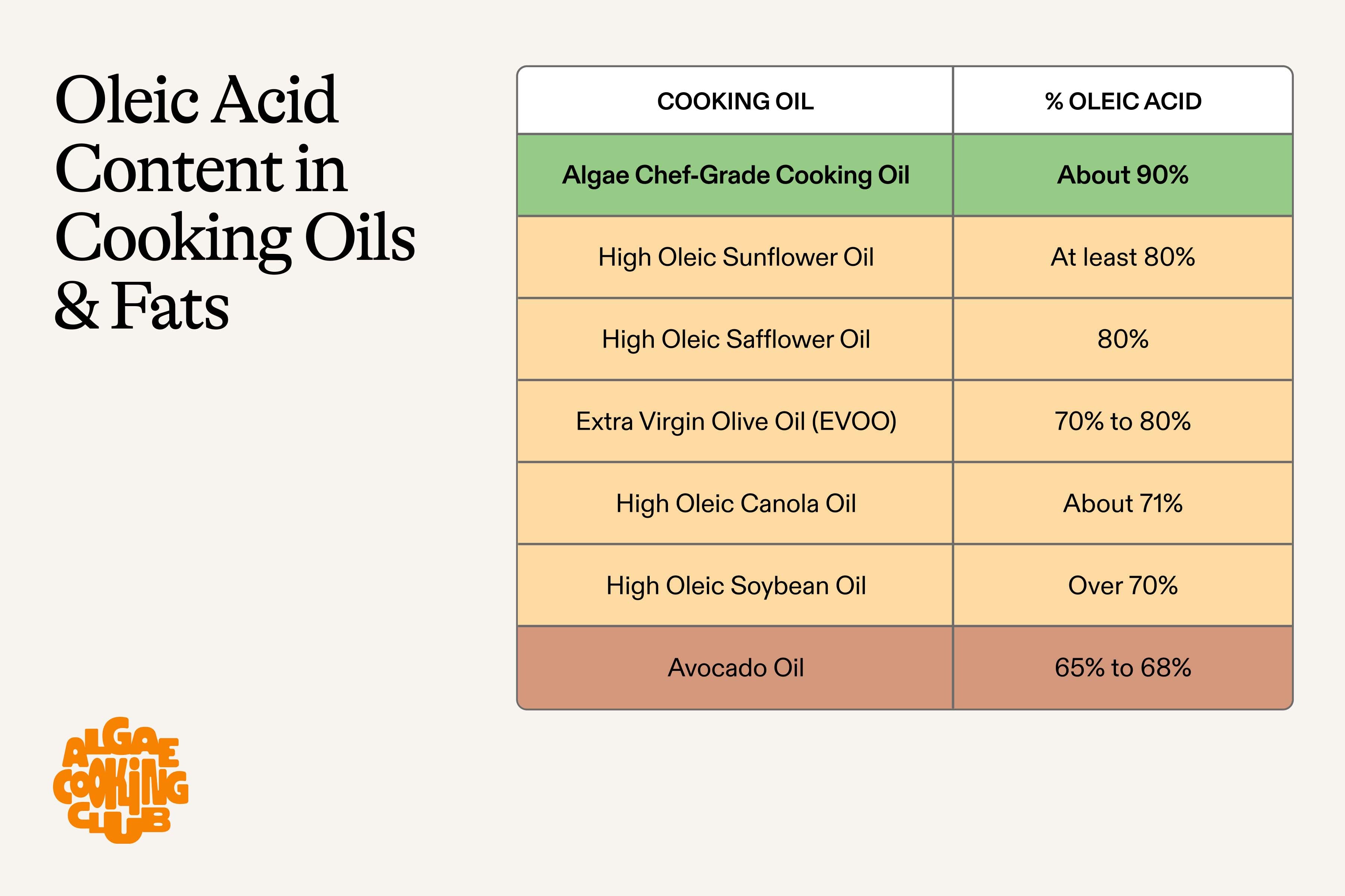 - Algae Cooking Oil - Algae cooking oil is a newer entrant in the culinary world, extracted from microalgae. It boasts a high smoke point of 535°F and a neutral flavor, making it versatile for various cooking methods. It is also very high in oleic acid, containing about 90%, which contributes to its stability and heart-friendly profile.