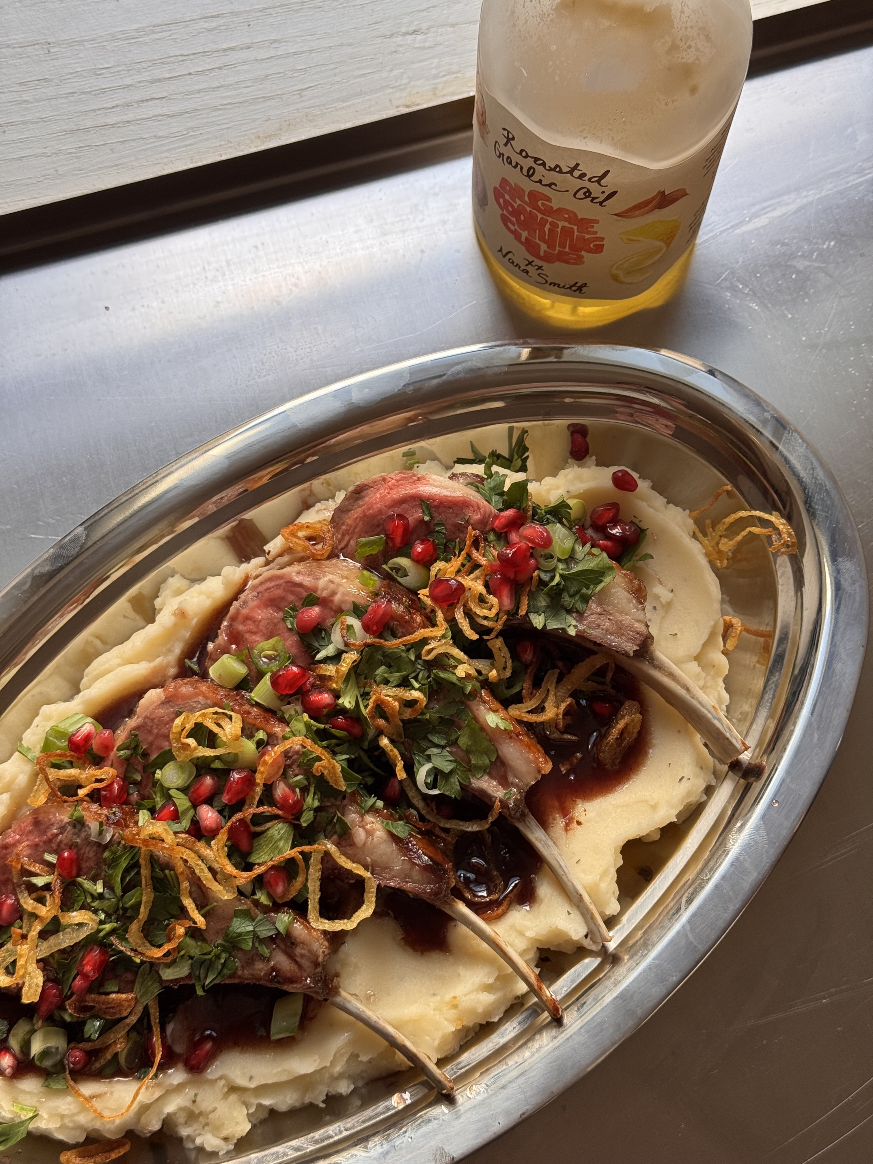 After at least 10 minutes of rest time, slice the lamb in between the bones into individual portions. Serve with mashed potatoes and top with your pan sauce, chopped parsley, fried shallots, and pomegranate seeds.